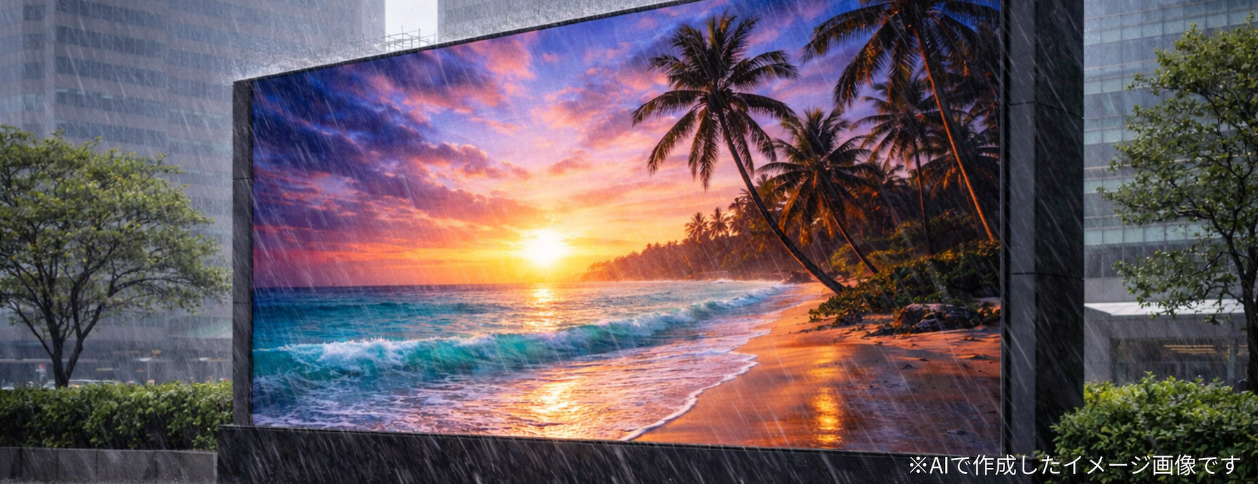 特に屋外にLEDディスプレイを設置する場合、雨や砂塵といった設置環境リスクへの耐性は製品選定の重要な判断基準になります。