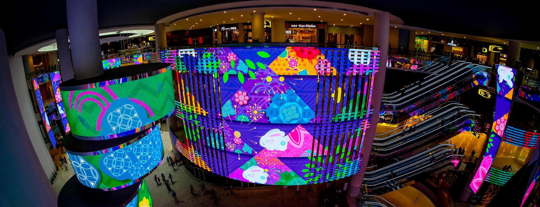 一方で、LEDディスプレイは自由に形を構築できるため、曲面、ドーム型、そして不定形、抜けのあるデザインまで、さまざまな形状の表現が可能になります。